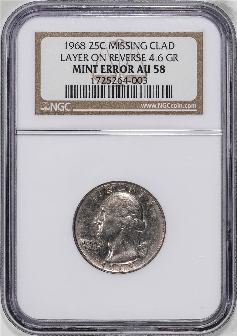 One 1968 Washington Quarter Coin Mint ERROR Missing Clad Layer on Reverse 4.6 GR NGC AU58. NGC Certified.