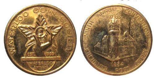 Waterloo Coin Club 9th Annual Convention, 1968 Gold medal. Obverse: Hand holding a coin against a maple leaf, with WATERLOO COIN CLUB, EST. 1959, WATERLOO ONTARIO. Reverse: Post office with 1868 below, with NINTH ANNUAL CONVENTION 1968 KITCHENER POST OFFI
