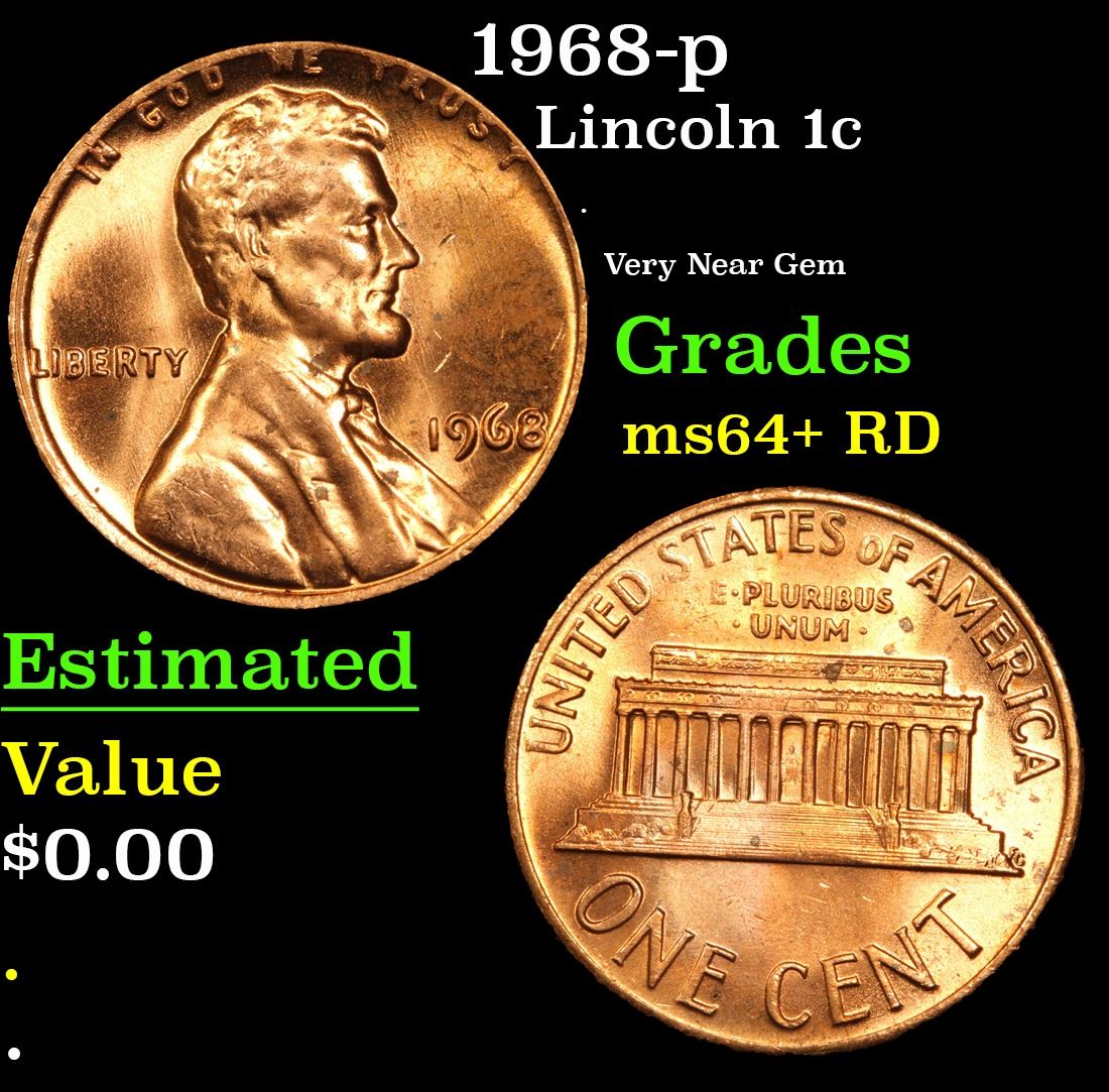 1968-p Lincoln Cent 1c Grades Choice+ Unc RD. Very Near Gem