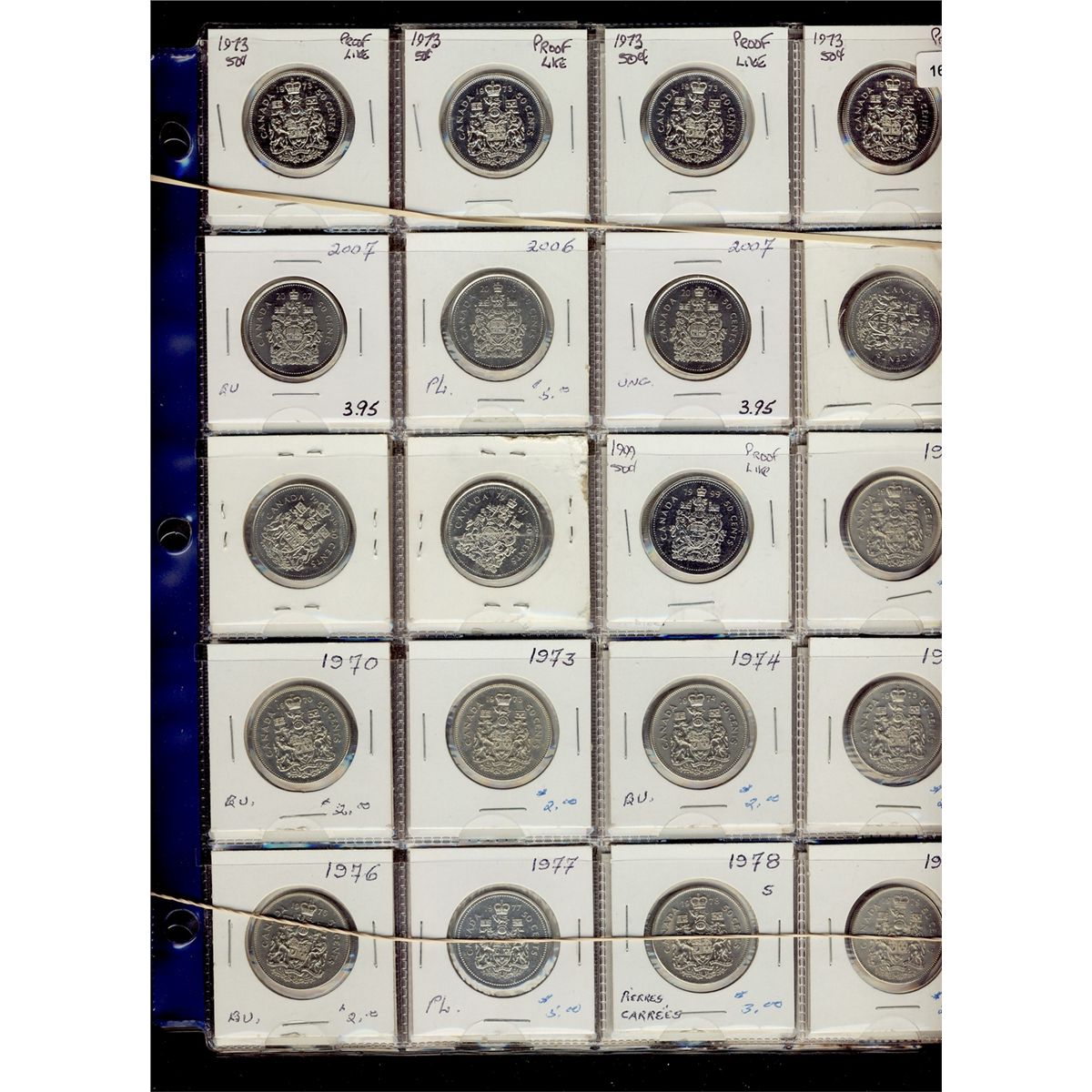 1968 to 2007 Nickel 50¢. An almost complete set with a few doubled examples. Missing 1983, 1989, 1991, 2001, 2003, 2003 & 2005. 60 coins in all. UNC to PL.