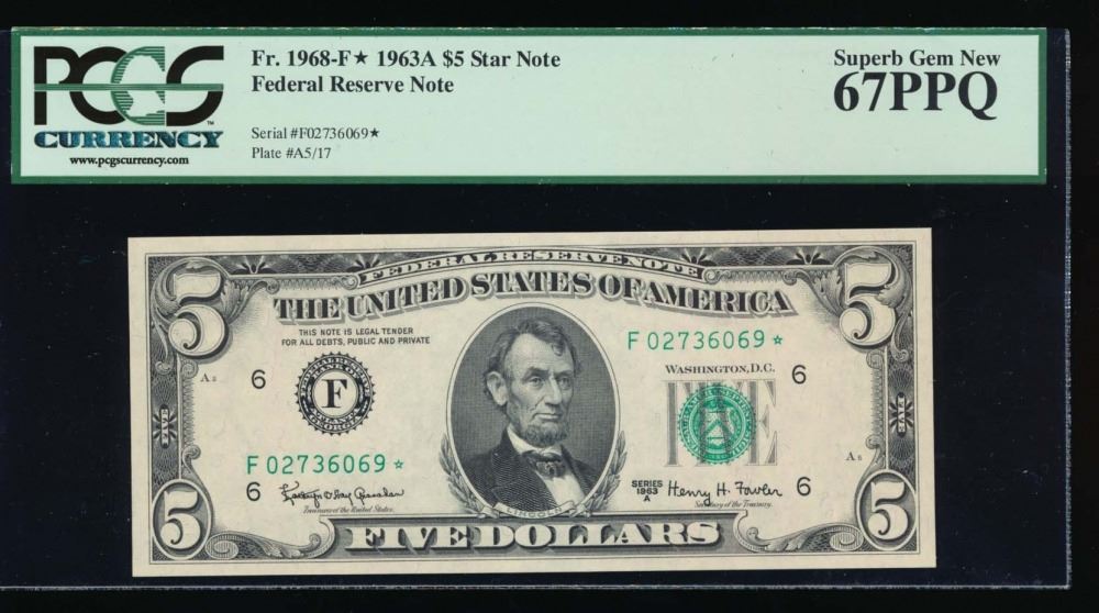 One 1968F $5 Atlanta Federal Reserve Star Note PCGS 67PPQ.
