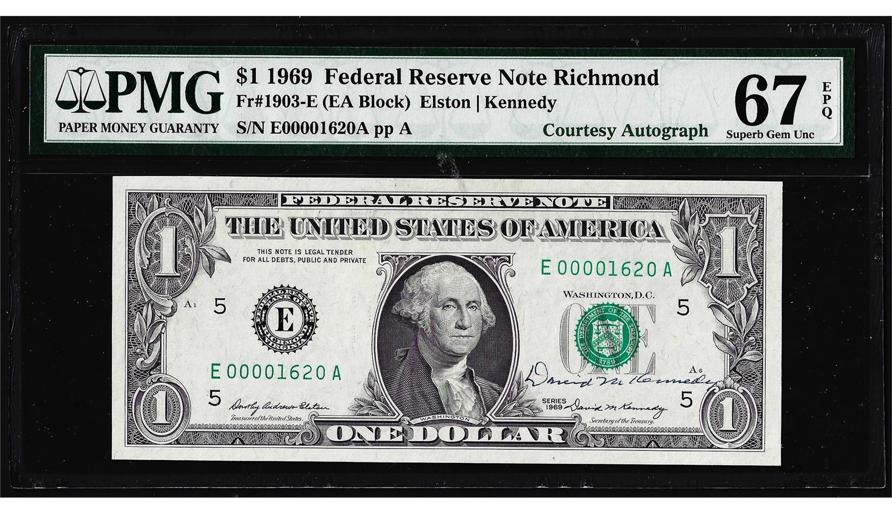 One 1969 $1 Federal Reserve Note Richmond Courtesy Autograph PMG Superb Gem Unc 67EPQ. PMG Certified.