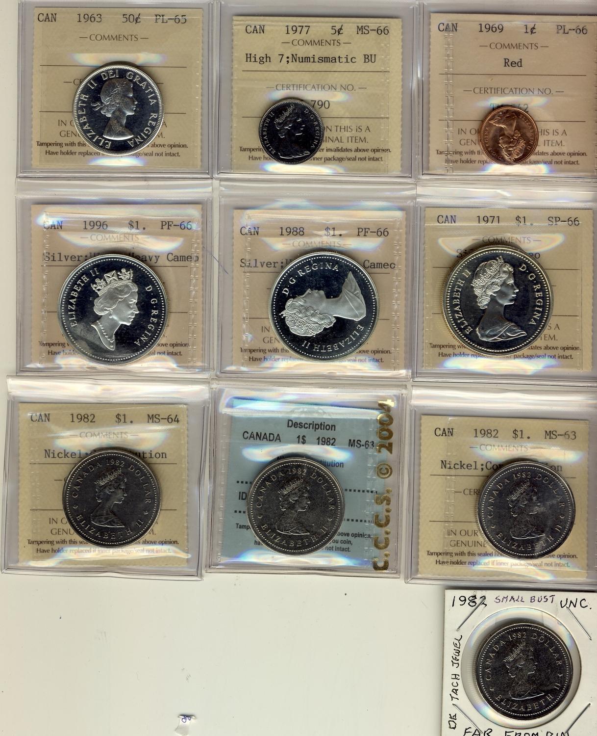 1969 1¢ PL66, 1977 5¢, 1977 5¢ High 77 MS66 NBU, 1963 50¢ PL65, 1971, 1988 & 1996 $1 PF66 two of which are UHC, 1982 $1 Nickel Constition MS63(2) and MS64 as well as a 1982 $1 small bust Constition ungraded.  Graded coins are ICCS with one 1982 being CCCS