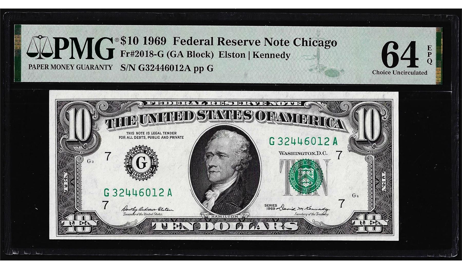 One 1969 $10 Federal Reserve Note Chicago Fr.2018-G PMG Choice Uncirculated 64EPQ. PMG Certified.