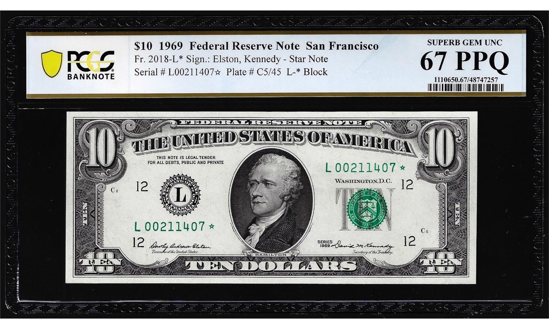 1969 $10 Federal Reserve STAR Note Fr.2018-L* PCGS Superb Gem Unc 67PPQ Top Pop