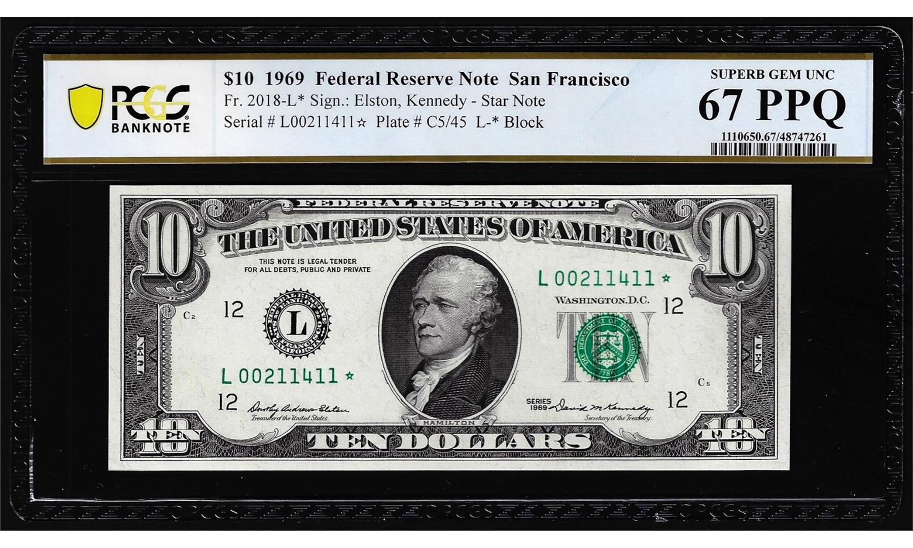 One 1969 $10 Federal Reserve STAR Note Fr.2018-L* PCGS Superb Gem Unc 67PPQ Top Pop. PCGS Graded.