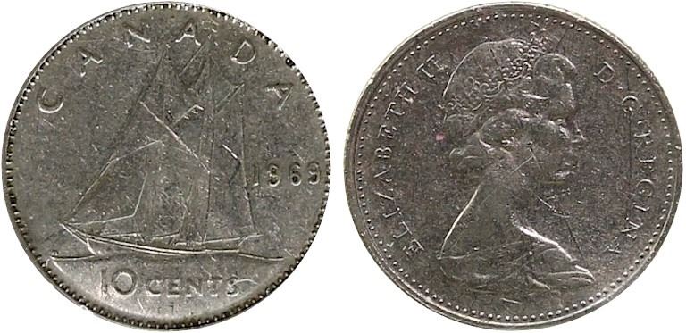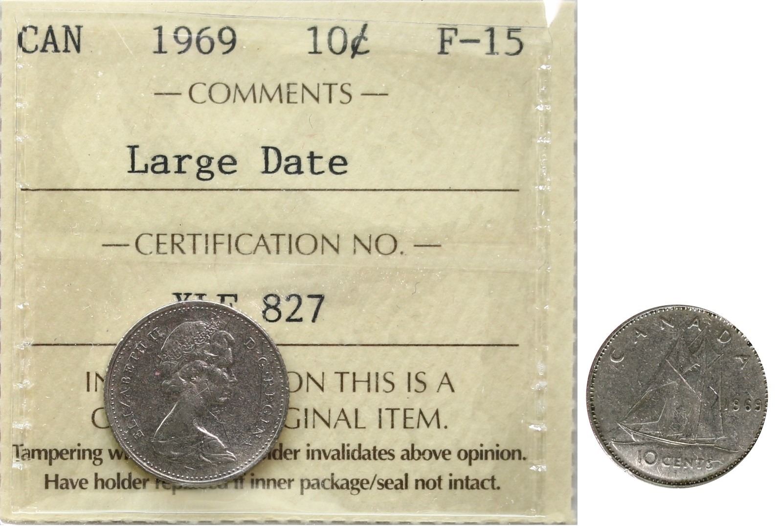 1969 10¢ "Large Date" ICCS Choice Fine-15. Very rare and sought after variety with decent reverse side and couple what looks to be meter marks on obverse. Only 3 examples offered by TCNC since 2015. Here is a great opportunity to acquire a true modern rarity. Looks much better than the assigned grade.