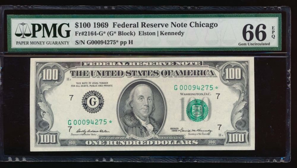 One 1969 $100 Chicago Federal Reserve STAR Note PMG 66EPQ.