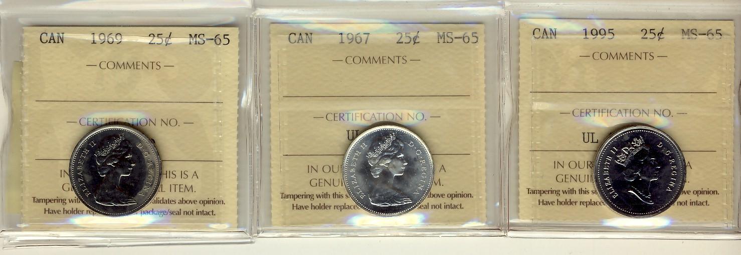 1969, 1967 & 1995 25¢ ICCS MS65. Lot of 3 coins.
