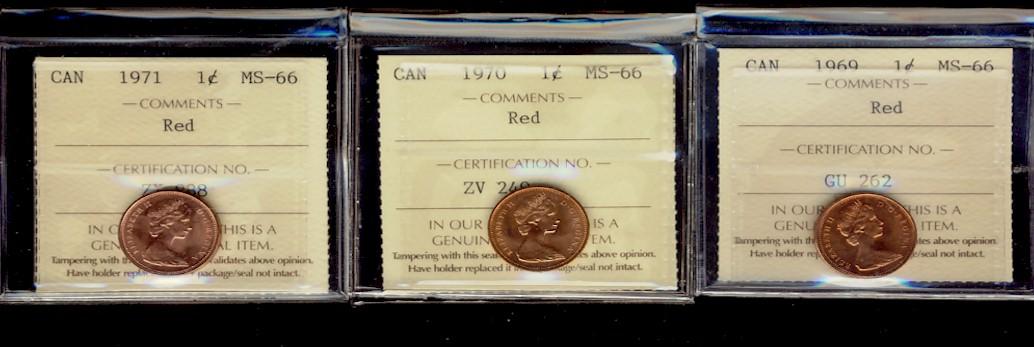 1969, 1970 & 1971 1¢ ICCS MS66RD. Lot of 3 coins.