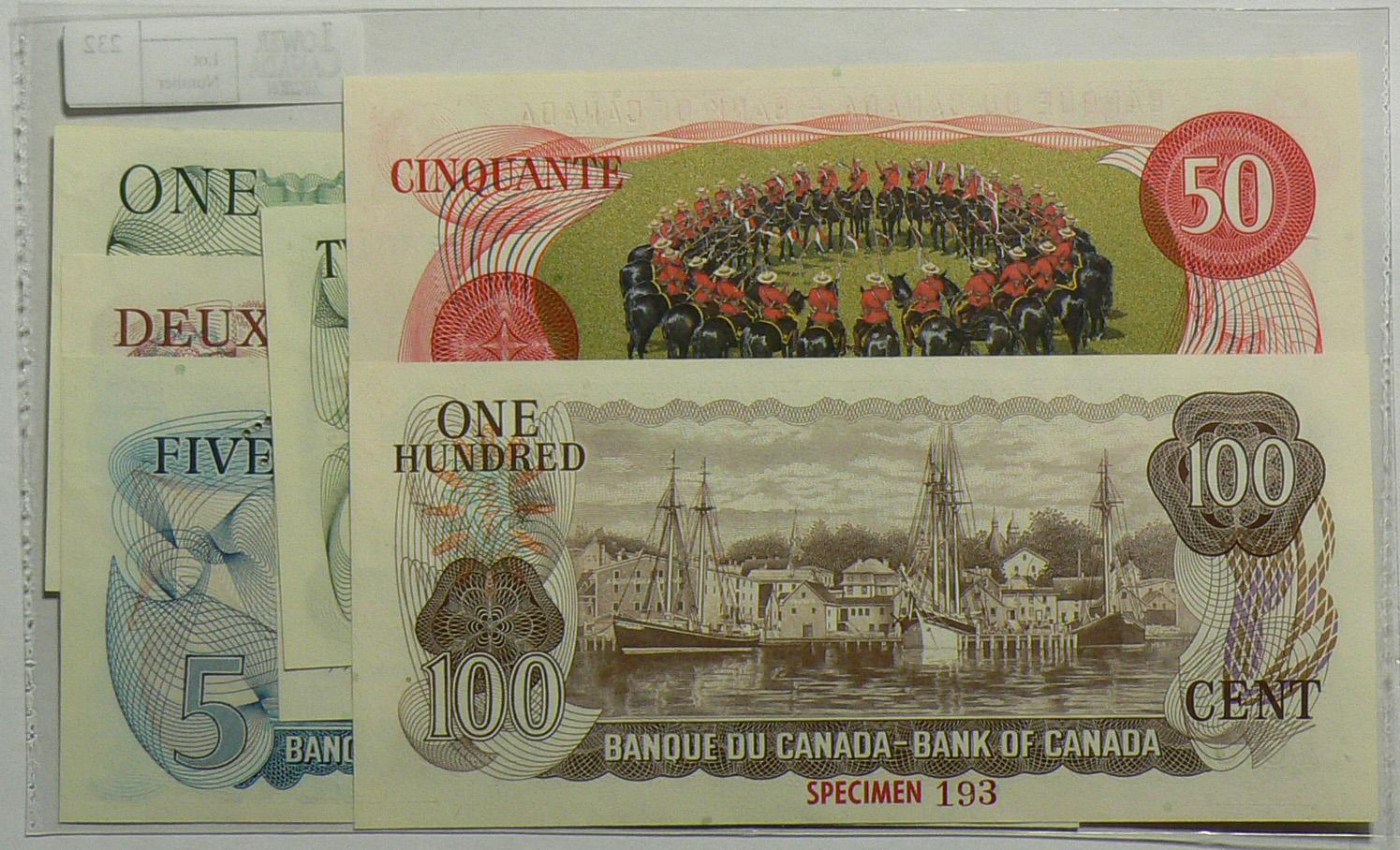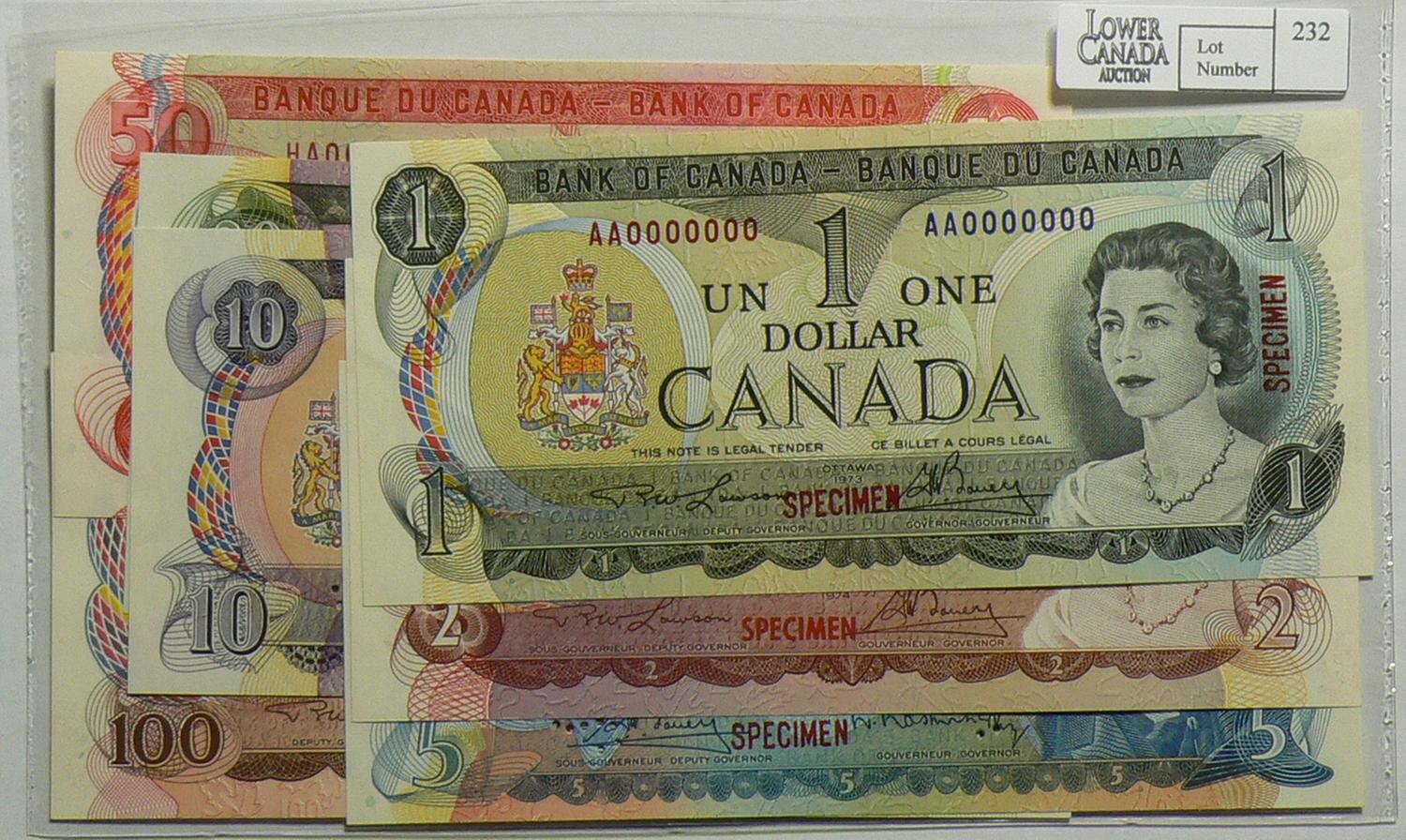 1969-1975 Multicolor Series Specimen Serial Set # 193, $1, $2, $5, $10, $20, $50 & $100 all serial 0000000 and AU/UNC as issue in the Bank of Canada Sale.