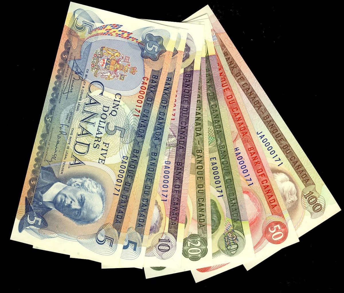1969-1979 Multicolor Match Set. Includes 7 notes from $5 to $100 as issued at the Bank of Canada Sale. Includes 1972 & 1979 $5, 1971 $10, 1969 & 1979 $20, 1975 $50 & $100. #171. AU to UNC