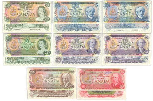 Low serial number matched set, #0000159, usually collected at the Bank of Canada for presentation. Consisting of 8 notes as issued and sold in 1999 from the Bank of Canada: $5(19723,1979), $10(1971 prefix DA & EDA), $20(1969,1979), $50, $100. Choice pris