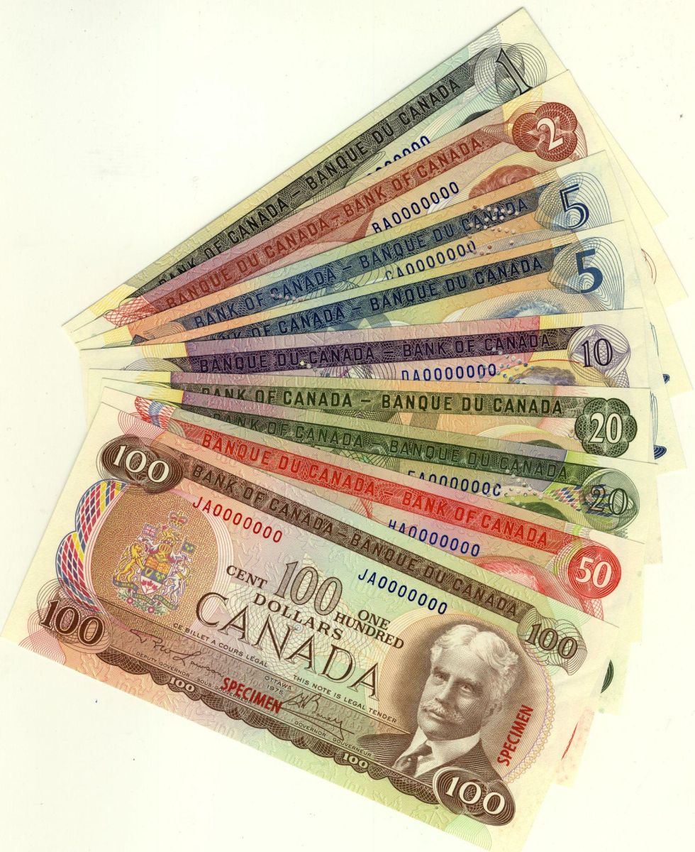 1969-1979 Multicolor Specimen Set. Includes 9 notes from $1 to $100 as issued at the Bank of Canada Sale. Set #190. AU to UNC.