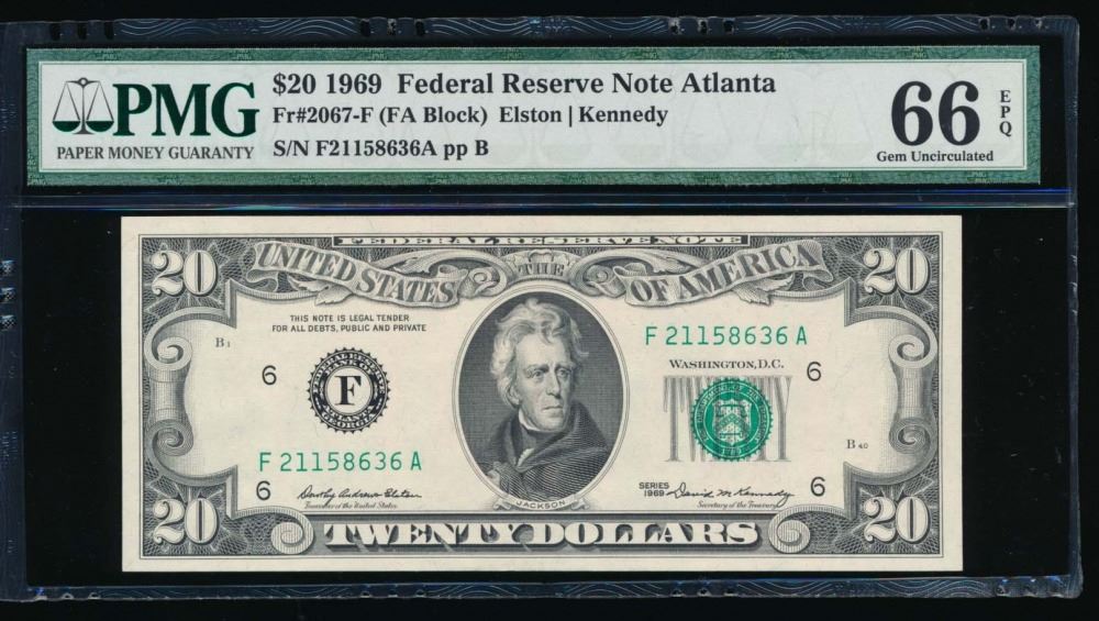 One 1969 $20 Atlanta Federal Reserve Note PMG 66EPQ.