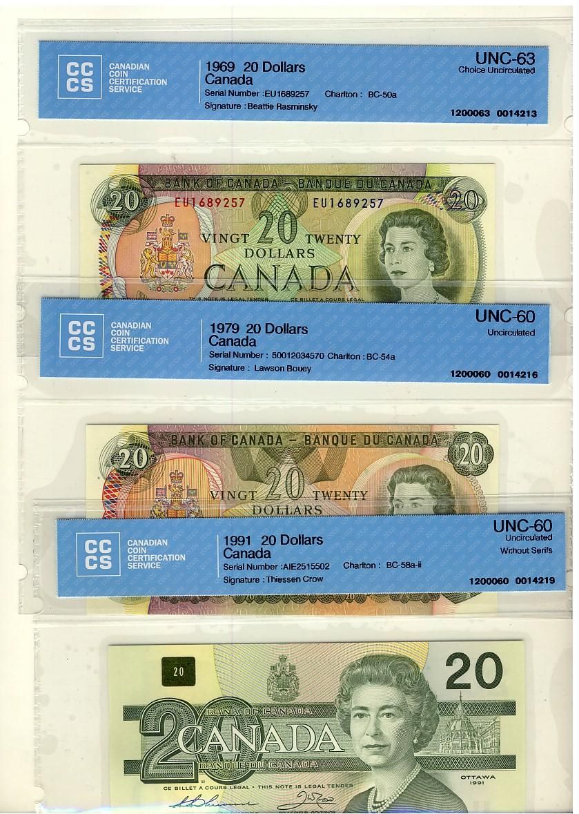 1969 $20 BC-50a, 1979 $20 BC-54a & 1991 $20 BC-58a-ii. Lot of 3 CCCS graded notes UNC 63 and UNC 60(2) respectively.