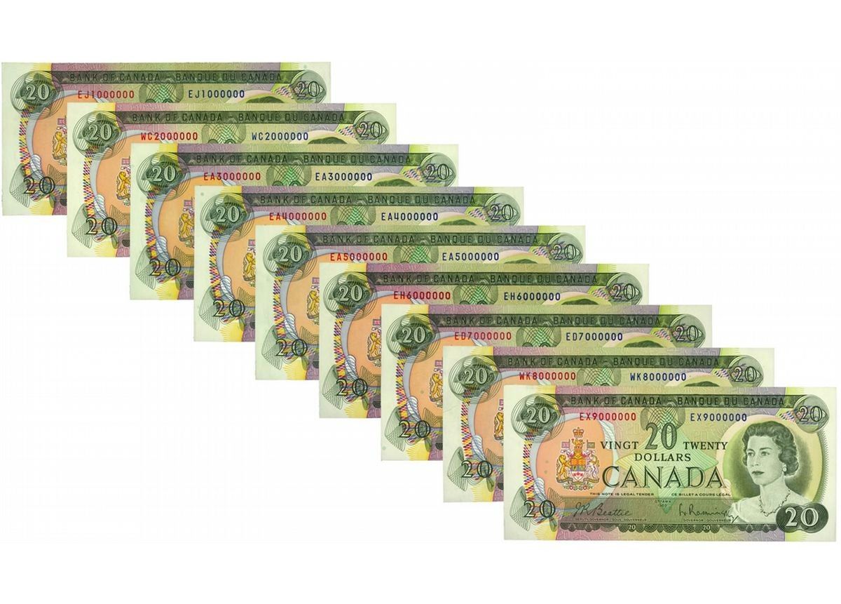 1969 $20 BC-50a/50b MILLION Set #1000000 to #9000000. Lot of 9 notes, all choice AU to Choice UNC. Rare complete series.