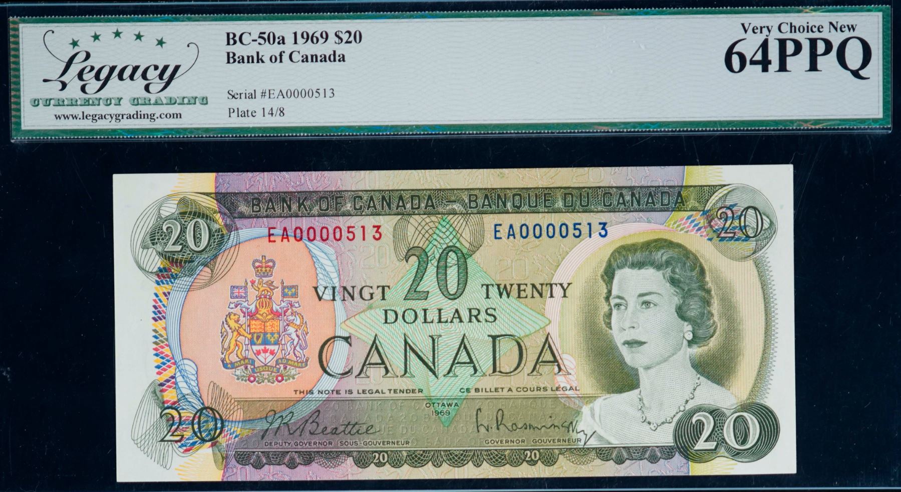 1969 $20 BC-50a #EA0000513, Legacy Choice Uncirculated-64PPQ. Nice Low Serial Number.