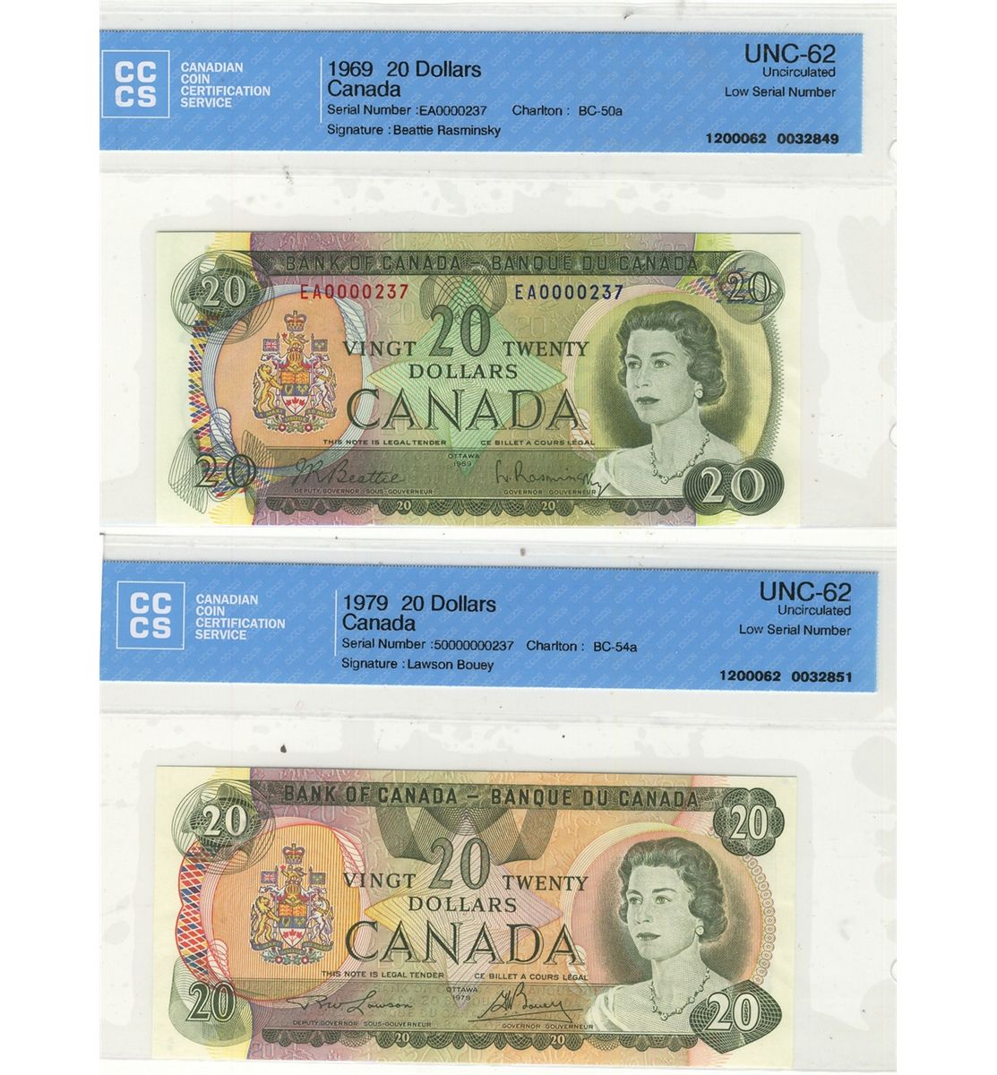 1969 $20 BC-50a and BC-54a Low Serial Number CCCS UNC-62.