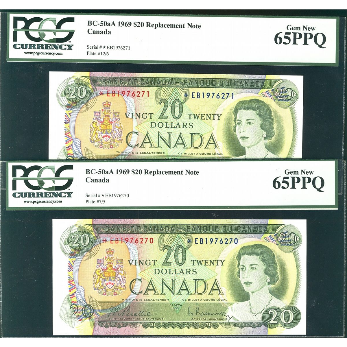 1969 $20 BC-50aA #*EB1976270-71 both PCGS UNC65PPQ.