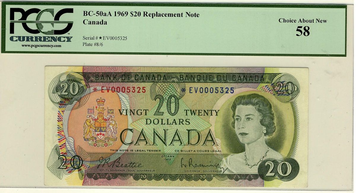 1969 $20 BC-50aA #*EV0005325 PCGS AU58. Rare replacement. Looks choice.