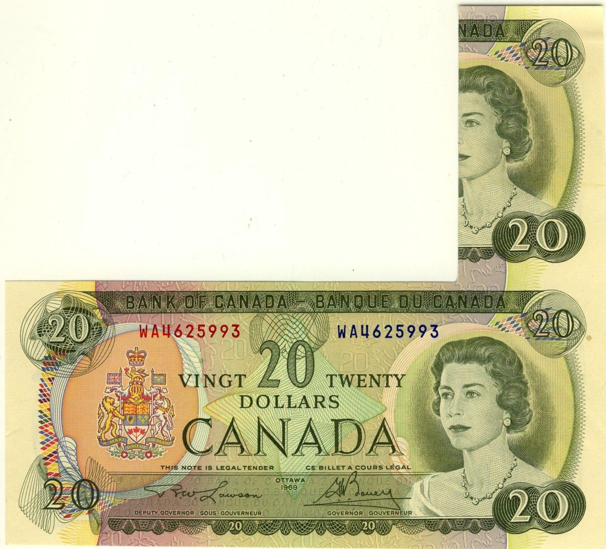 1969 $20 BC-50b ERROR note, #WA4625993. Major cutting error with 25% of note upper note from original sheet remaining attached the the bottom note.
