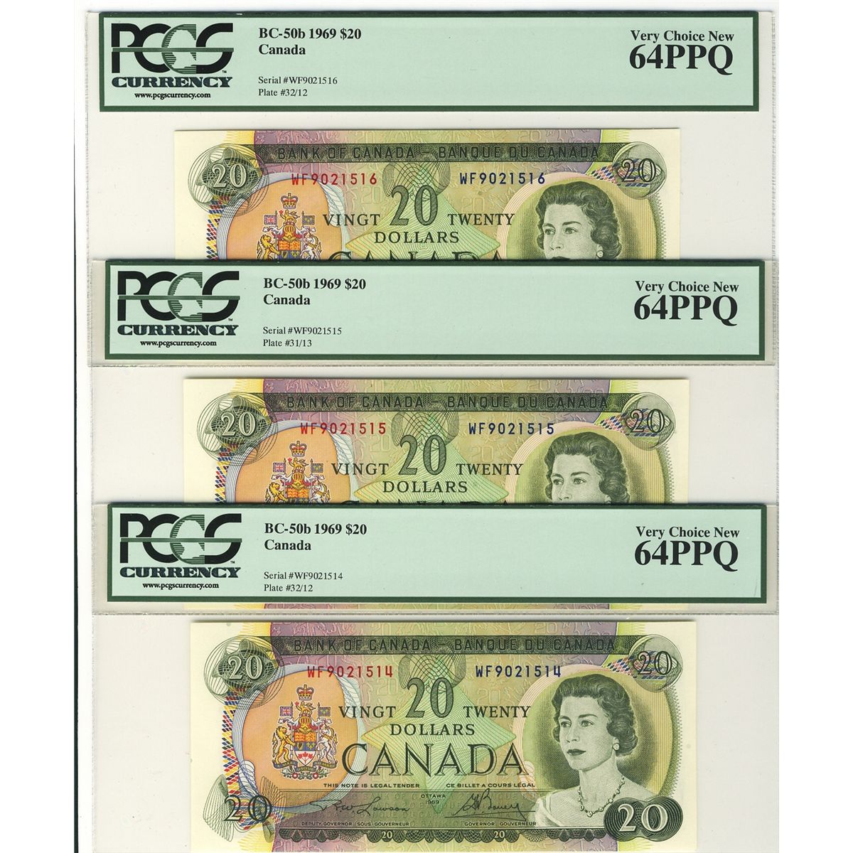 1969 $20 BC-50b #WF9021514-516 PCGS CH UNC64PPQ. Lot of 3 consecutive notes.