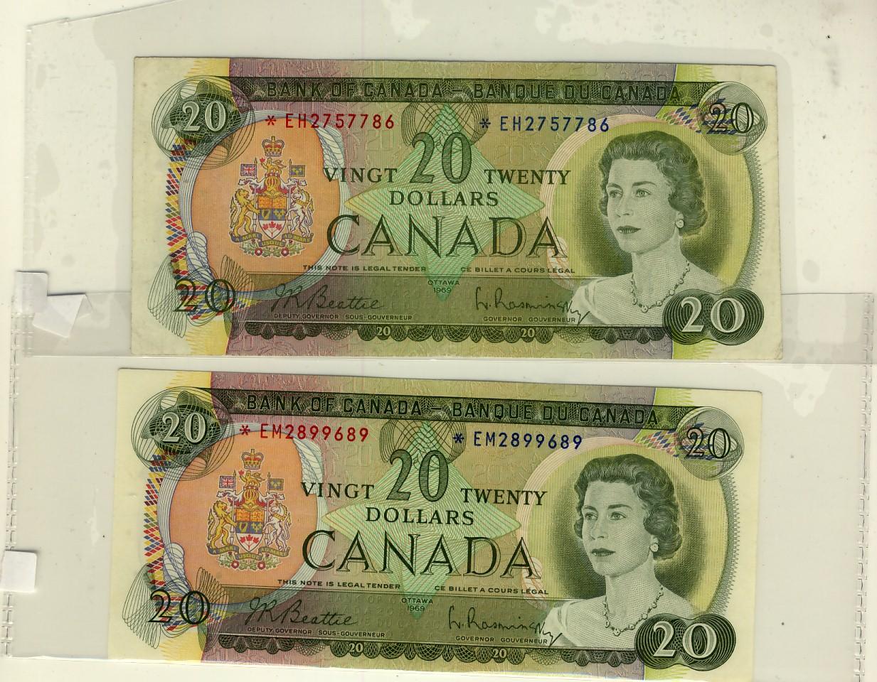 1969 $20 BC-aA #EH2757786 & #*EM2899689. Lot of 2 notes EF to AU.