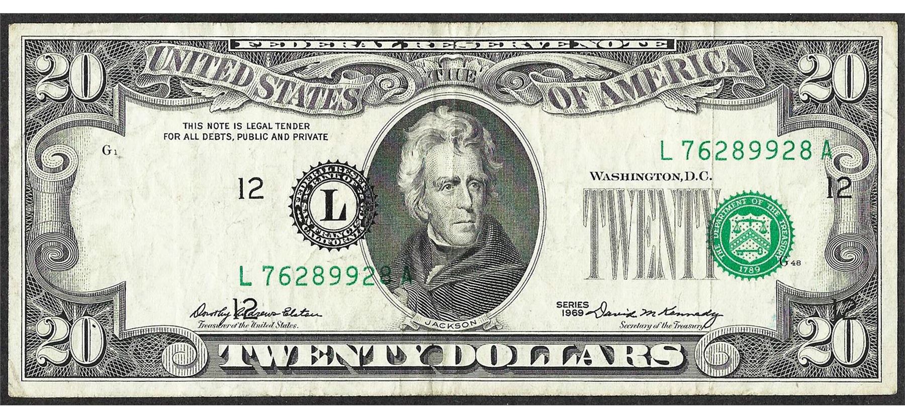 One 1969 $20 Federal Reserve Note Misalignment ERROR.