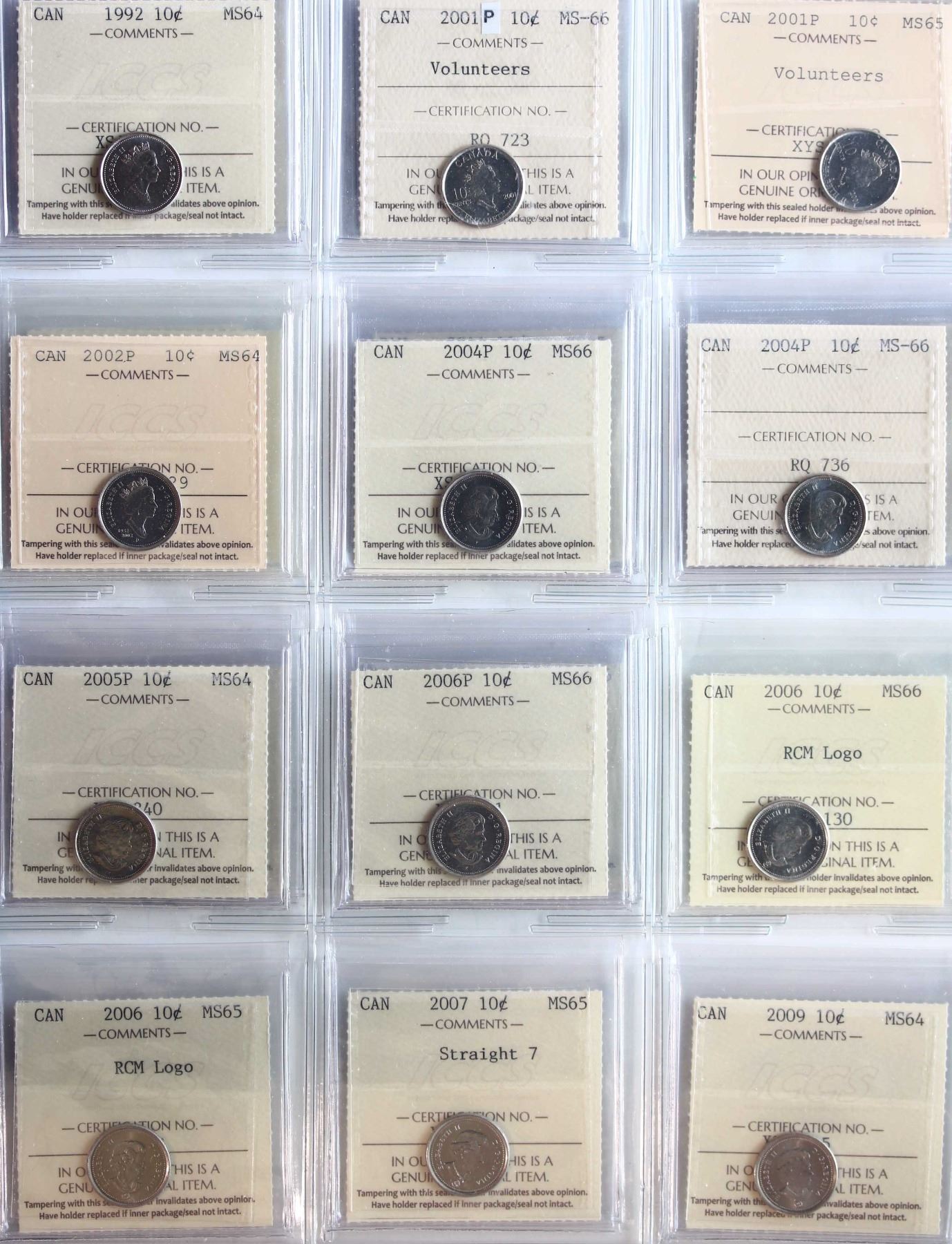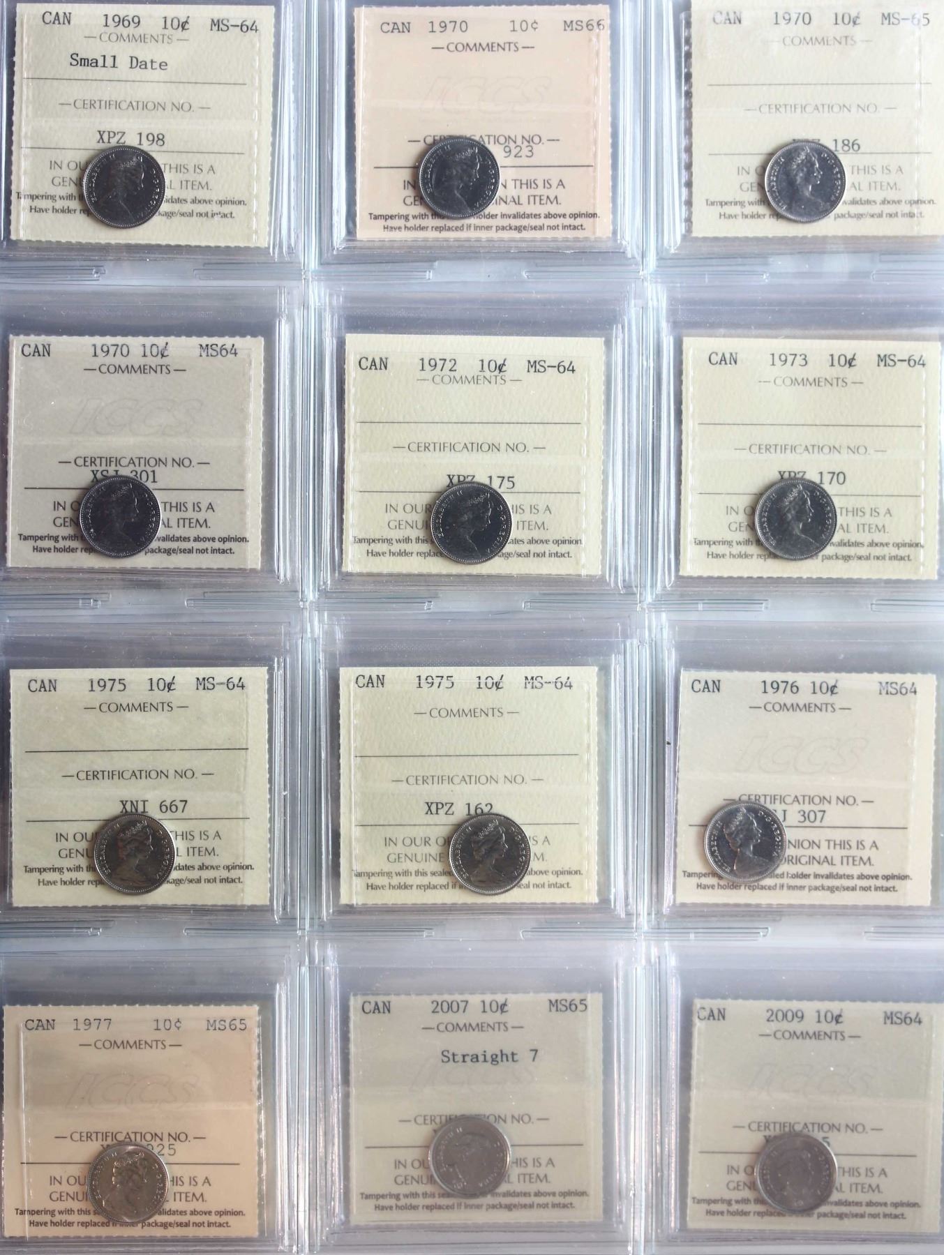 1969-2017 10¢ All 30 coins ICCS Very Choice Mint State-64 to Superb Gem Mint State-66. includes some varieties.