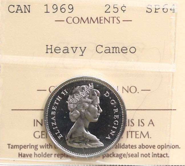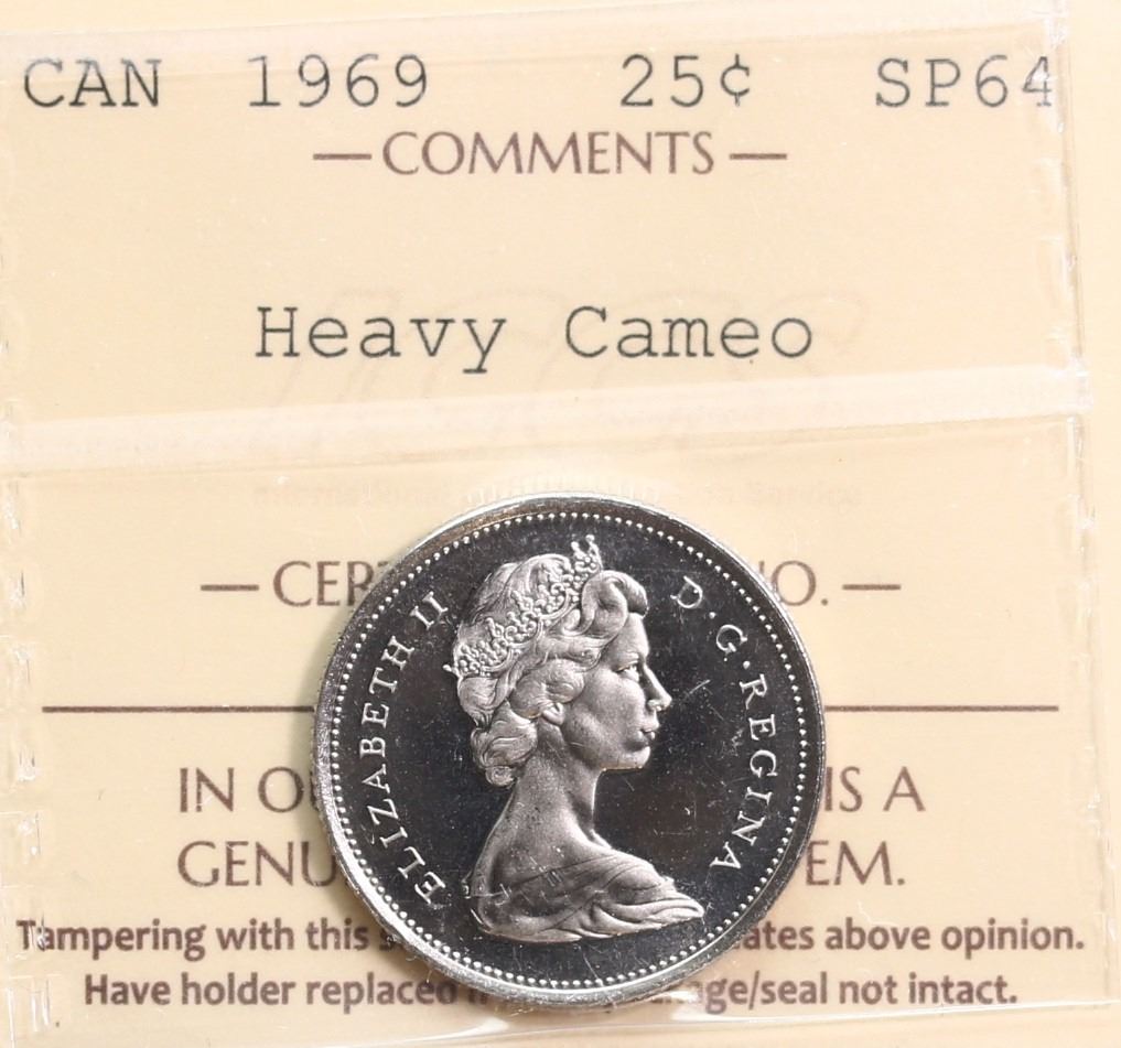 1969 25¢ ICCS Choice Specimen-64 Heavy Cameo. An incredible rarity from the same specimen set as the three preceding lots, this specimen displays a beautiful strike with mirrored fields and a frosted portrait. Another important opportunity to acquire one of these special coins. We wish good luck to anybody in this sale who finds themselves working on assembling one of these rare sets of 1969 coinage.