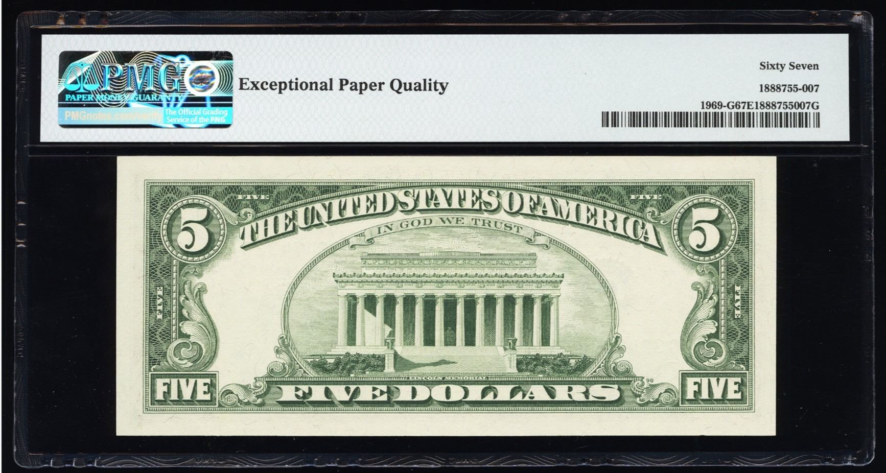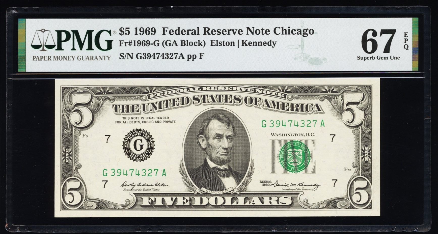 One 1969 $5 Chicago FRN PMG 67EPQ.
