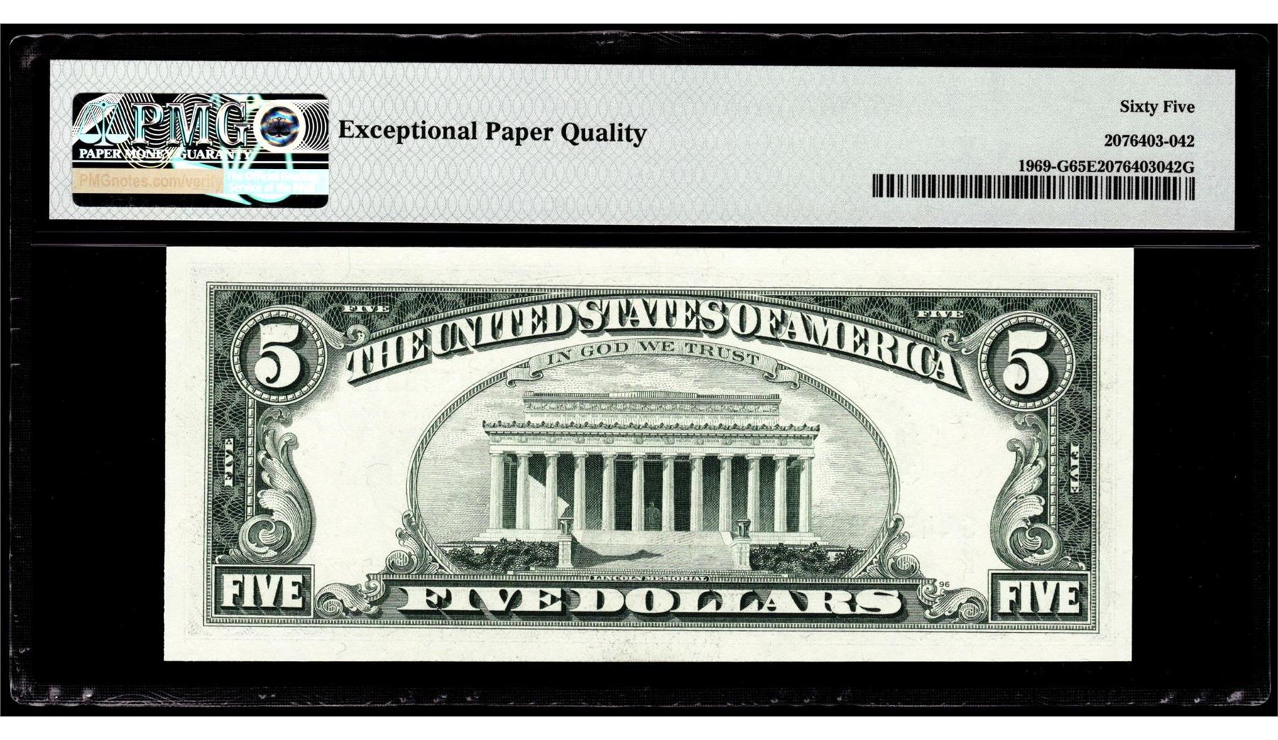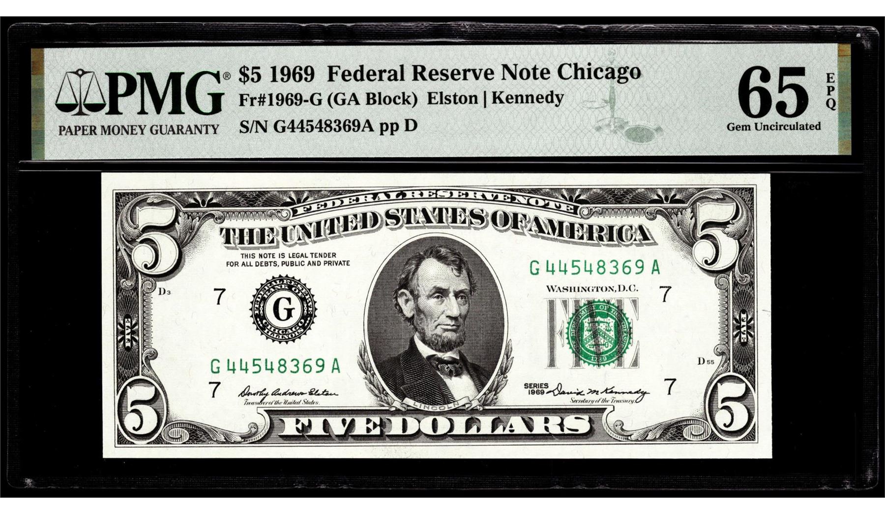 One 1969 $5 Federal Reserve Note Chicago Fr.1969-G PMG Gem Uncirculated 65EPQ. PMG Certified.