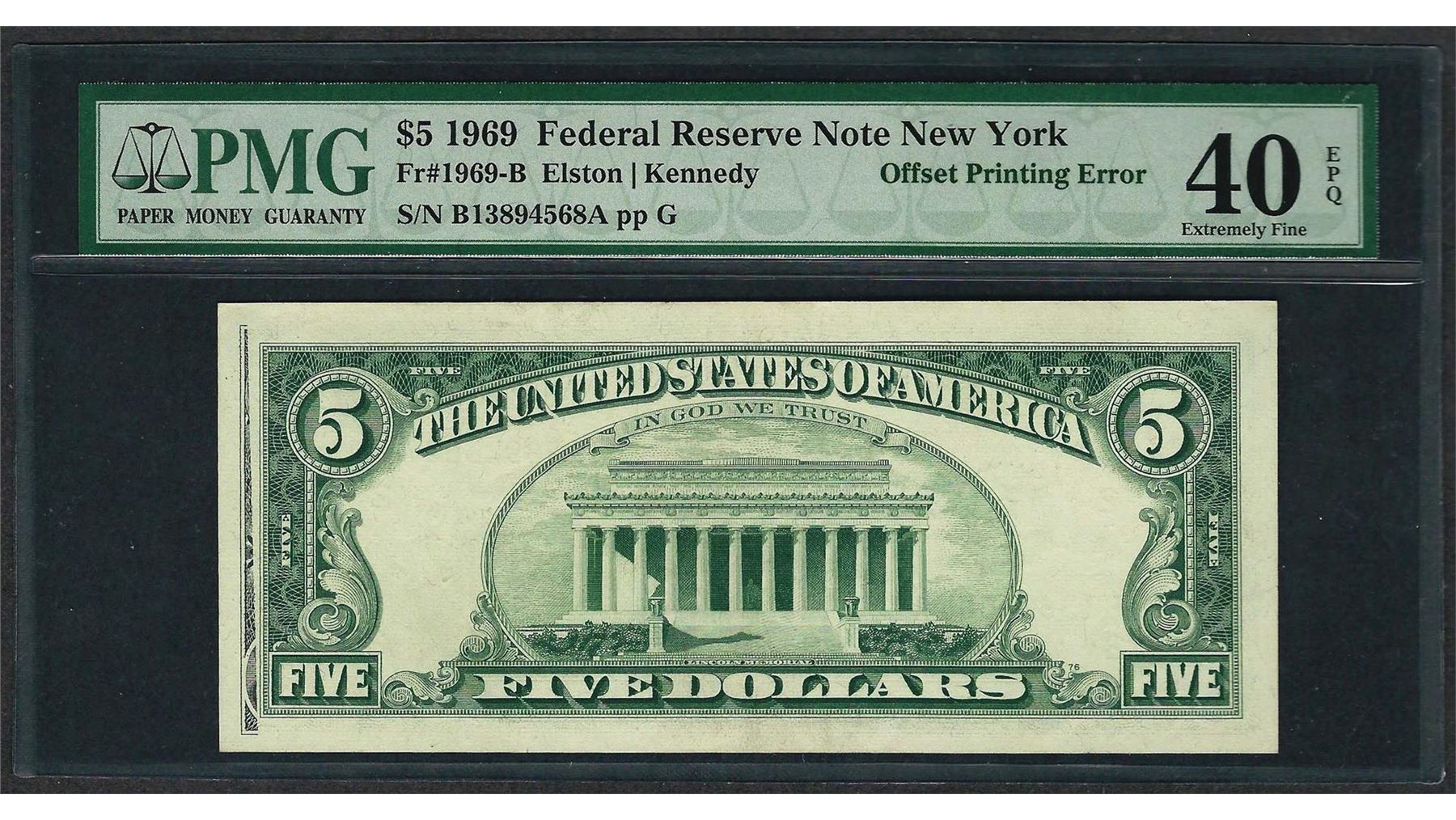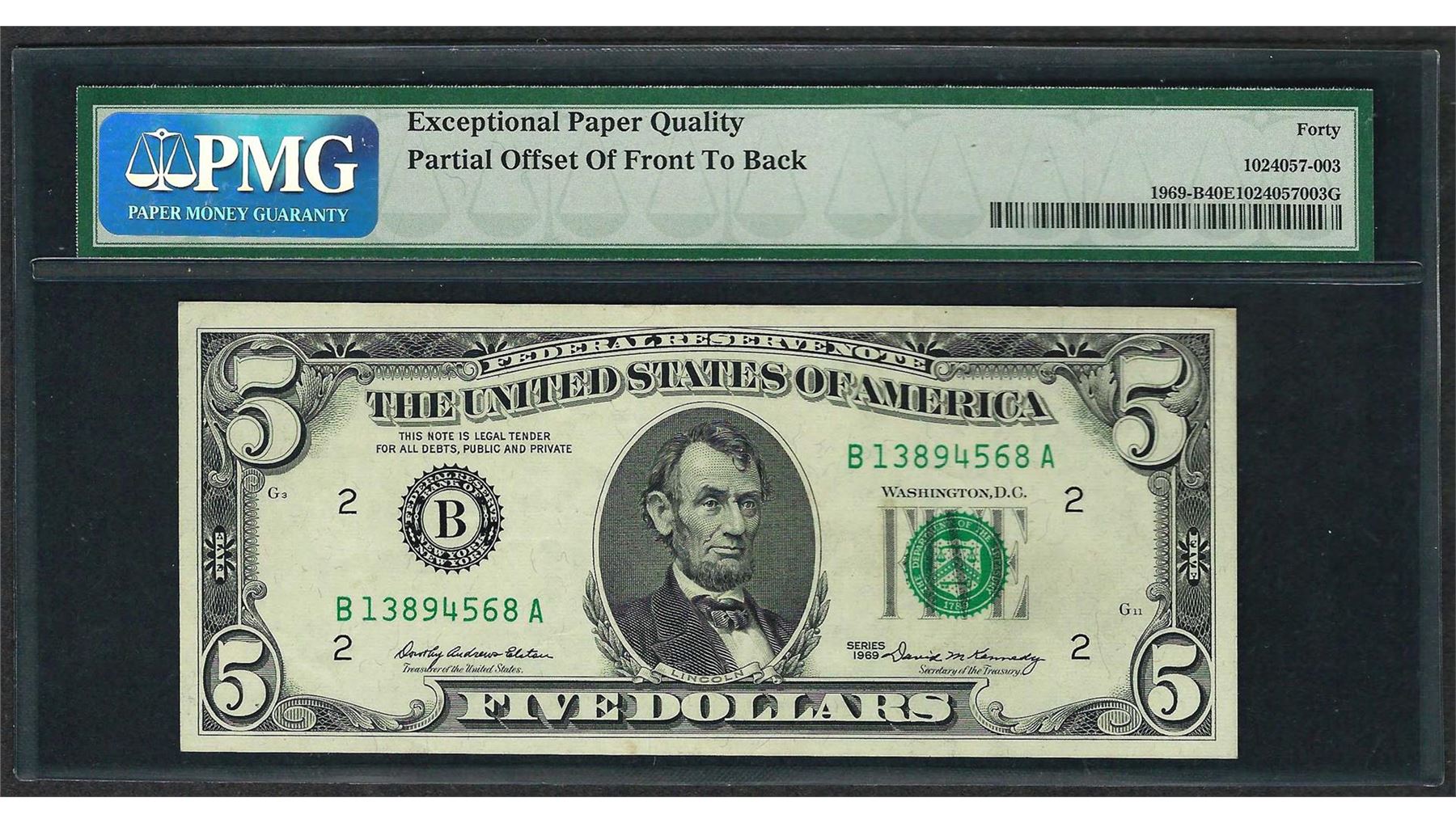 One 1969 $5 Federal Reserve Note ERROR Offset Printing PMG Extremely Fine 40EPQ. PMG Certified.