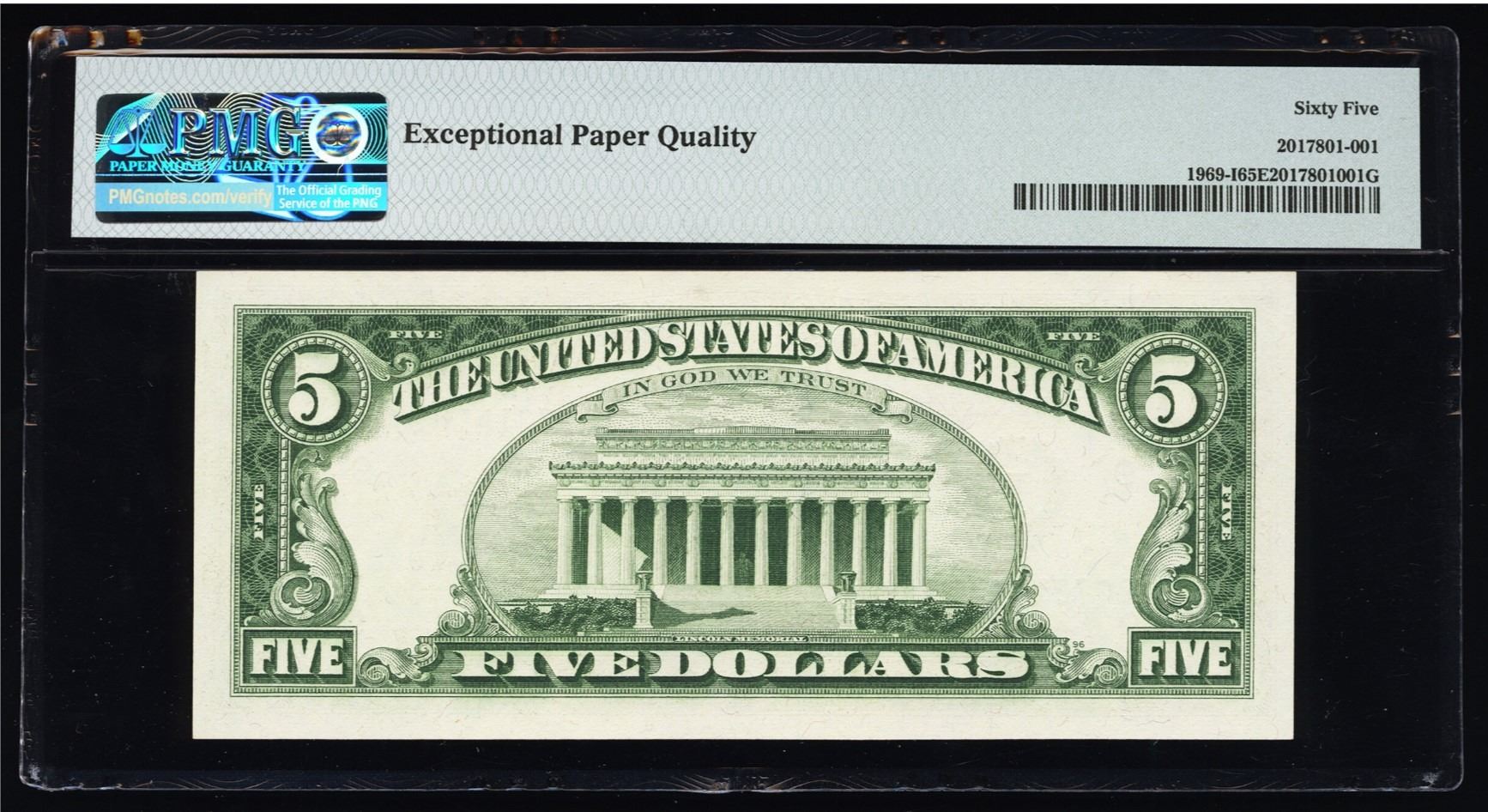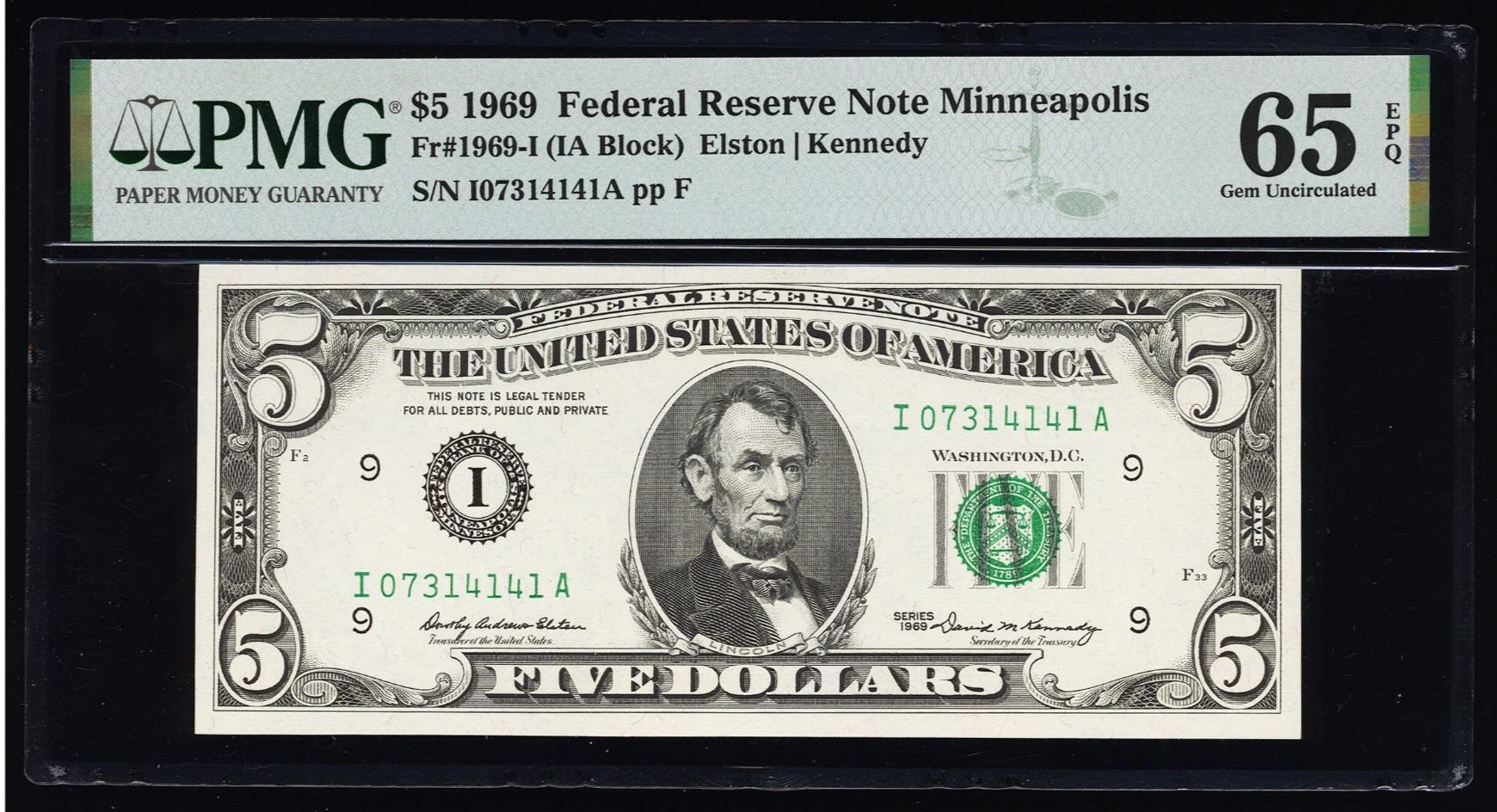 One 1969 $5 Minneapolis FRN PMG 65EPQ.