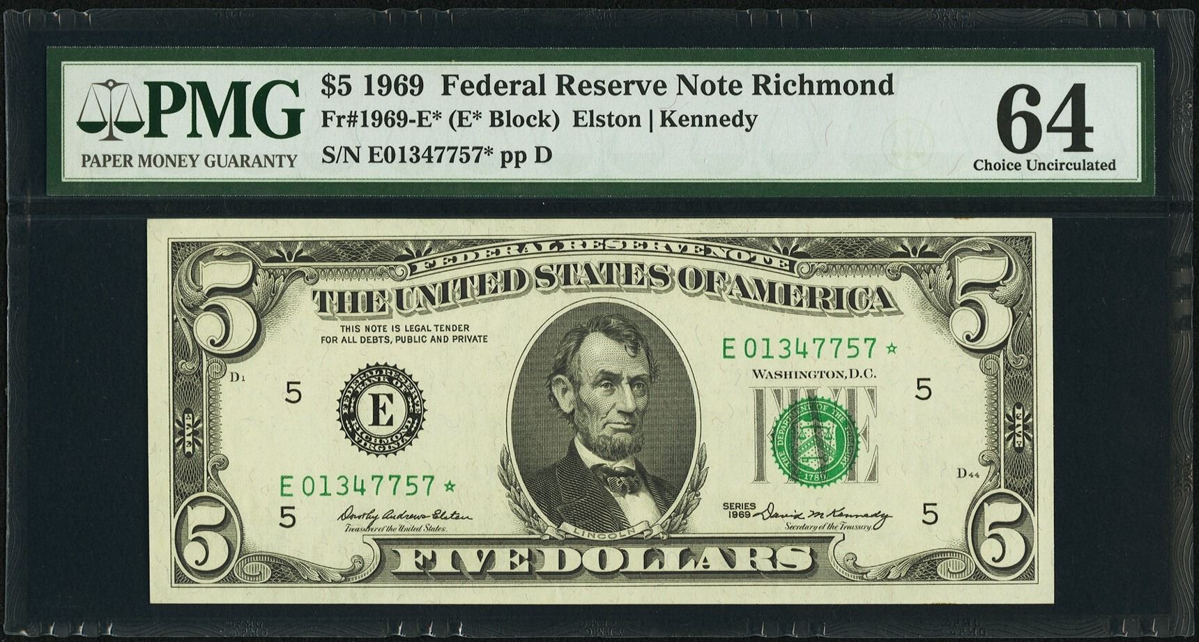 One 1969 $5 Richmond Federal Reserve STAR Note PMG 64.