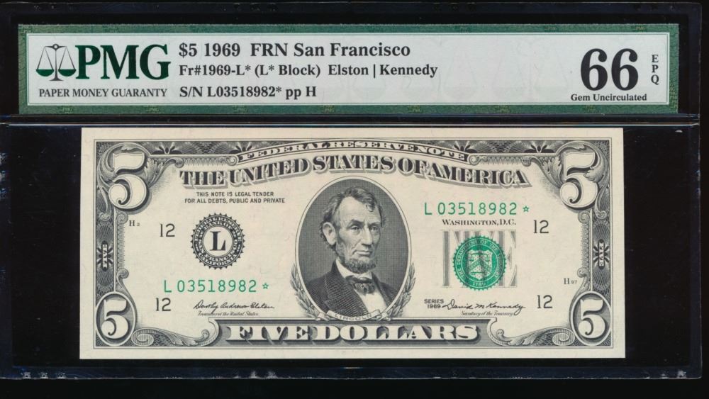 One 1969 $5 STAR San Francisco FRN PMG 66EPQ.