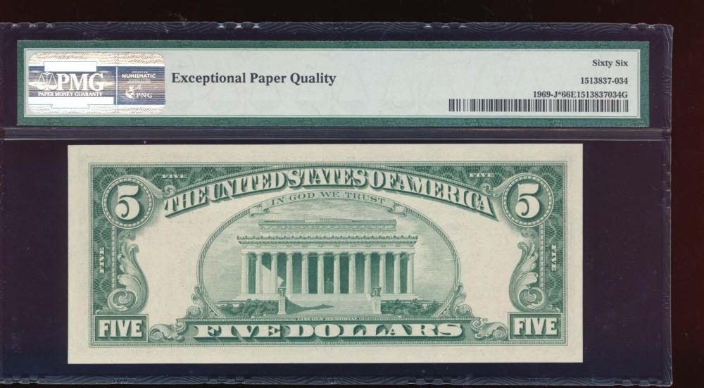 One 1969 $5 San Francisco Federal Reserve Note PMG 66EPQ.