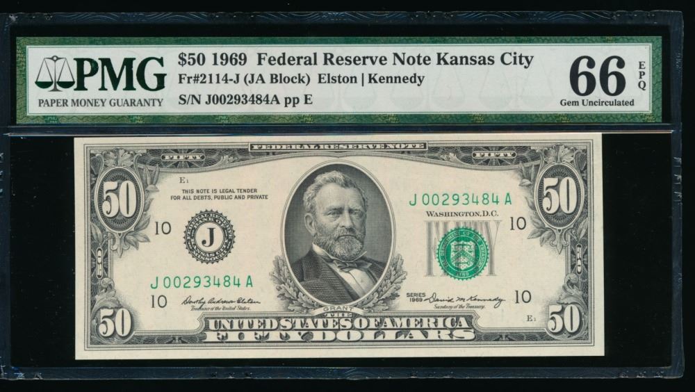 One 1969 $50 Kansas City FRN PMG 66EPQ.
