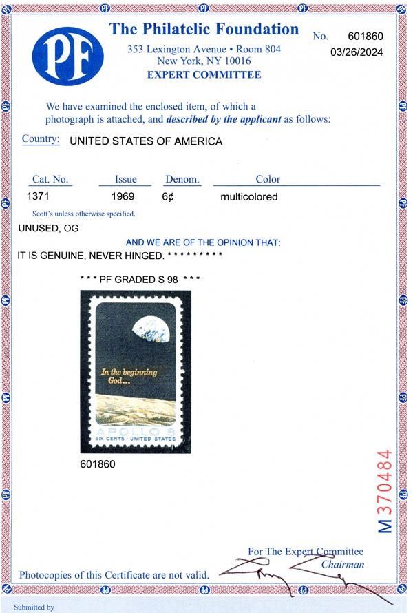 1969, 6¢ Apollo 8. Scott 1371. SMQ $75, Sup, with 2024 P.F. certificate graded SUP 98