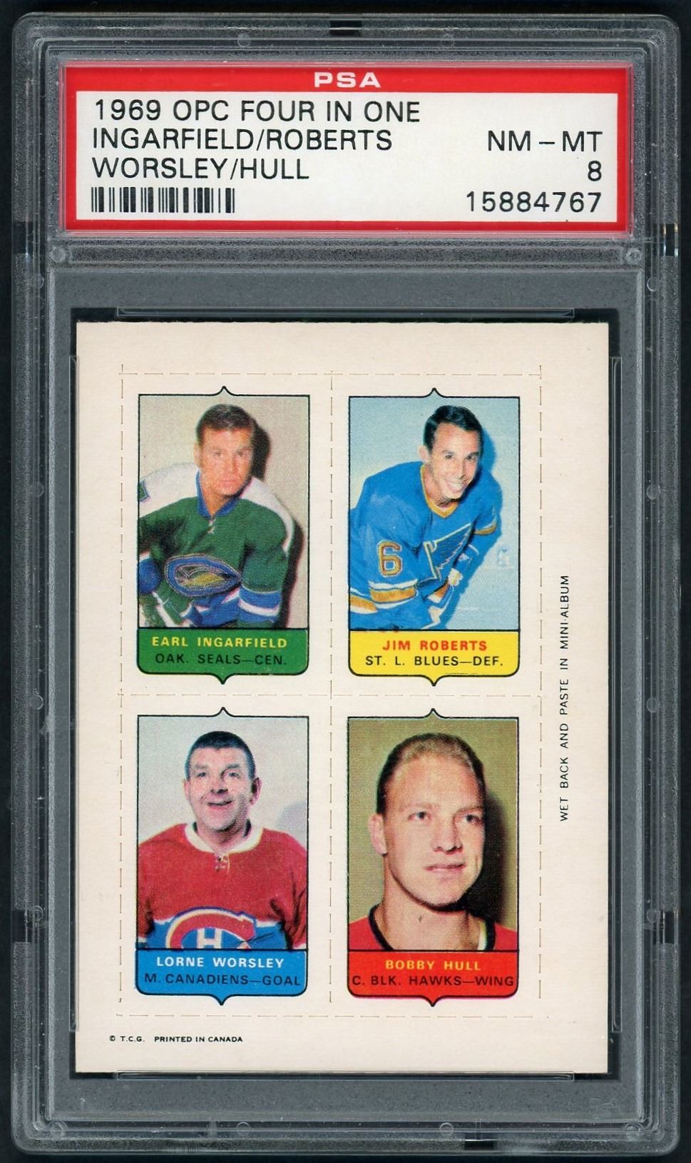 Awesome insert from the 1969-70 O-Pee-Chee set, always tough in great condition, this one features HOFers Bobby Hull and Gump Worsley, graded 8 NM-MT by PSA!
