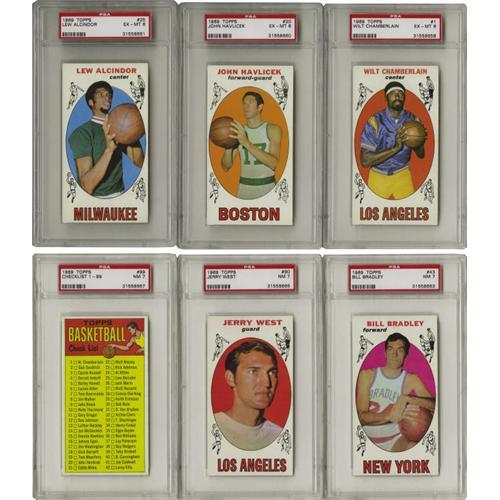 <B>1969-70 Topps Basketball High-Grade Complete Set (99).</B></I> One of the most collectible basketball sets in the hobby, this classic "tall boy" issue includes plenty of key Hall of Fame rookie cards including Thurmond, Hawkins, Cunningham, Lucas, Bing, Unseld, Reed, Hayes, Monroe and DeBusschere. Condition issues typically plague the set, so a fantastically high-grade offering like this is a rare occurrence. The Lew Alcindor rookie, issued before he even played a game with the Milwaukee Bucks, was the inspiration behind Topps reestabishing itself in the basketball card market with a 99-card issue. Highlights include 1969-70 Topps PSA 7: #35 Baylor, 43 Bradley, 50 Robertson, 90 West, 98 Frazier, 99 Checklist; PSA 6: #1 Chamberlain, 20 Havlicek, 25 Alcindor. Graded cards have an aggregate SMR value of $1175. Balance of the set averages EX/MT or better with none falling lower than EX status. <BR><BR><B>Important notice:</B> Heritage usually auctions material at the rate of 200-250 lots per hour. On some occasions eBay Live bid software or the Internet may not be able to keep up with the pace of the auction. We recommend placing a realistic absentee bid now as insurance to avoid disappointment. Occasionally the auctioneer may eliminate or reject an eBay Live bid, and the auctioneer may also reopen a lot after the close of the eBay live bidding (usually because we missed an audience bid), and may reject your bid even if it shows you as the winning bidder. By bidding via eBay Live, you agree that Heritage may award the lot to another bidder at its sole discretion under the circumstances described above or any other reasonable circumstances. Since eBay bids are not shown to us until we open the lot on the floor, we treat those bids just like floor bids. In most cases the floor responds before the eBay bid is presented to us, due to Internet lag time, so for consistency we have made it a policy that floor bids are always considered first over tie eBay live bids. Also please note that all Heritage lots purchased through eBay Live carry a 22.5% Buyer's Premium. Please make sure you read the Terms and Conditions before you bid. This lot is being auctioned in conjunction with a live floor auction by Heritage Galleries & Auctioneers. All final auction and invoice information will be supplied by Heritage Galleries & Auctioneers, and all other information should be considered preliminary. Lot:19216 <BR><BR><B>Winning Notification and Billing:</B> After the FINAL session in this auction is complete, Heritage will send e-mail and snail mail invoices. This process normally takes several days. All final auction and invoice information will be supplied by Heritage Galleries & Auctioneers, and all other information should be considered preliminary. <BR><BR>This auction will be conducted on a live auction floor and over the Internet through eBay Live. If you choose to place an absentee bid, please take a moment to <font color='#0000ff'><u><a href='http://pages.ebay.com/liveauctions/help/before/laabsentee.html'>learn how eBay Live absentee bidding works</a></u></font><font color='#000000'>