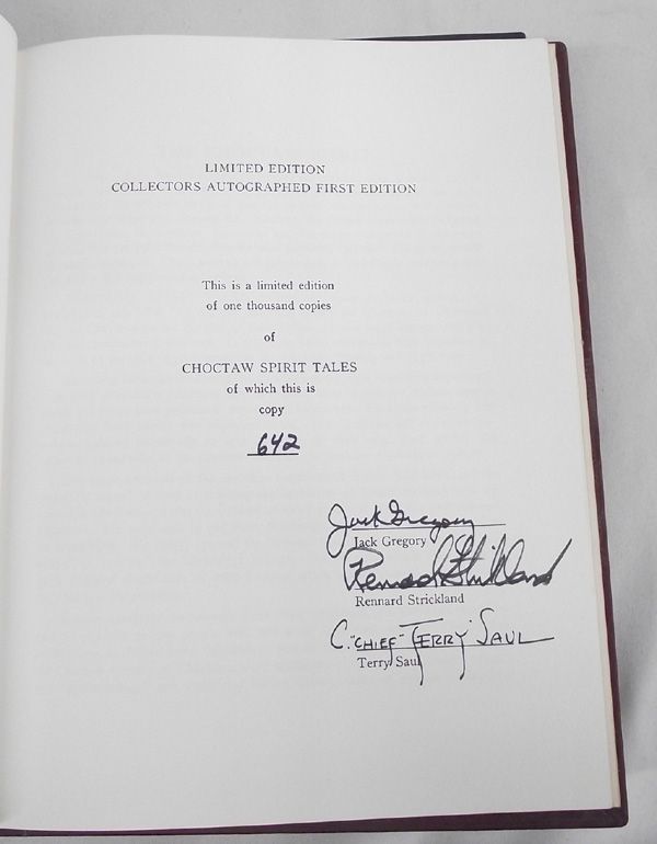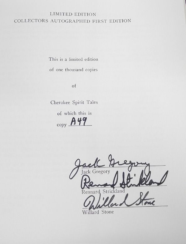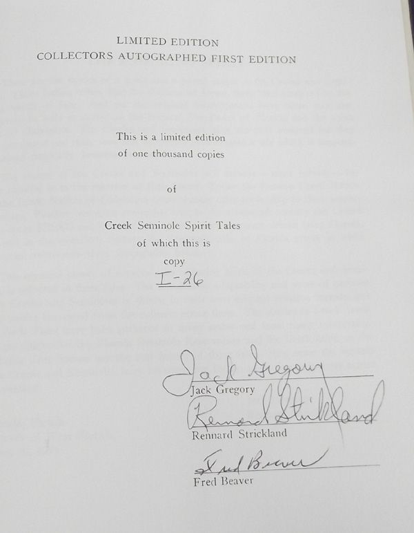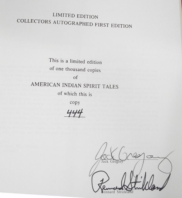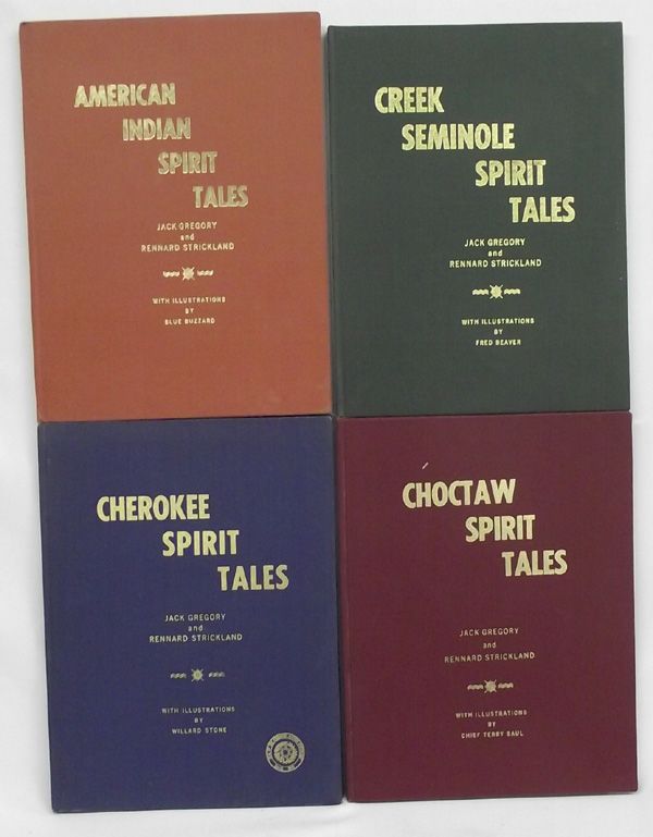 1969-74 Signed Limited Edition Books Indian Spirit. These are 4 hardback books, all written by Jack Gregory and Rennard Strickland, which present folklore stories of Native Americans. Each is illustrated by a different artist. The books are: Creek Seminole Spirit Tales; American Indian Spirit Tales; Choctaw Spirit Tales; Cherokee Spirit Tales. Each book is hardback, less than 50 pages, and measures 12''H x 9.5''W. They are all signed, numbered editions of a limited edition and were published between 1969-1974.