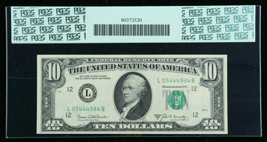 1969-B, $10 Federal Reserve Note. Offset Error. PCGS Gem New 65PPQ. . Fr-2020-L. A strong 90%+ face to back offset appears on this scarcer issue 1969B $10 Federal Reserve Note.