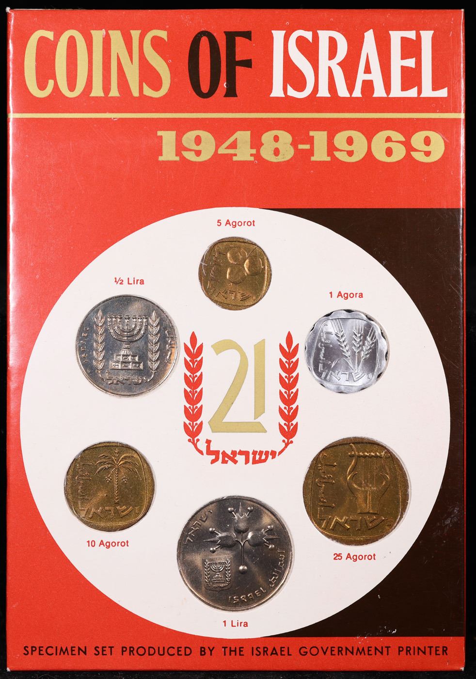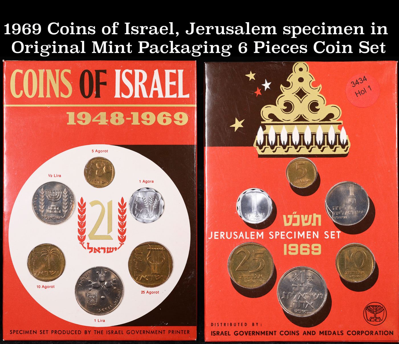 1969 Coins of Israel, Jerusalem specimen in Original Mint Packaging 6 Pieces Coin Set. Set in Original Mint Packaging the 1968 Israeli coin set is composed of six different denominations 1 agora, 5 agora, 10 agora, 25 agora, half-lira, and 1 lira. These coins are part of the 1975 year set issue that have the Star of David. Four of these coins are made of aluminum-bronze. The 1 agora coin is made of aluminum and the 1 lira coin is made of copper-nickel. One side of the coins all have the country name and face value in Hebrew, an engraving from old coins, and the Star of David. The other side of the coins features different agricultural products of Israel and the state emblem of Israel: a menorah flanked by two olive branches. However, the half-lira coin only shows the state emblem. The coins in the set are in mint condition.