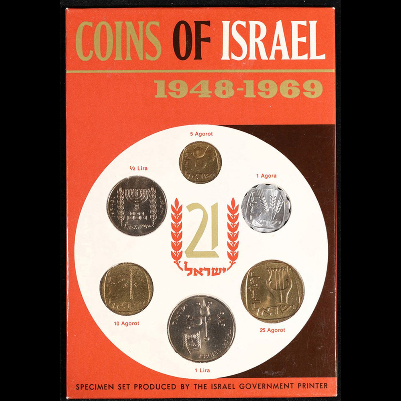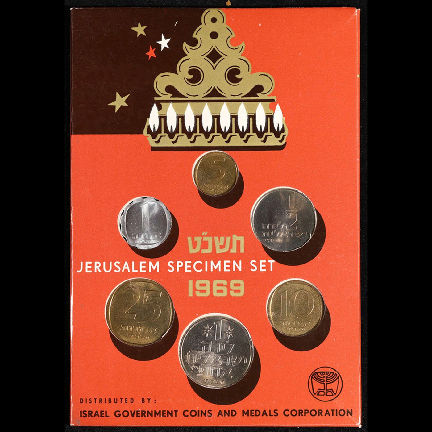 1969 Coins of Israel, Jerusalem specimen in Original Mint Packaging 6 Pieces Coin Set. Set in Original Mint Packaging the 1969 Israeli coin set is composed of six different denominations 1 agora, 5 agora, 10 agora, 25 agora, half-lira, and 1 lira. These coins are part of the 1975 year set issue that have the Star of David. Four of these coins are made of aluminum-bronze. The 1 agora coin is made of aluminum and the 1 lira coin is made of copper-nickel. One side of the coins all have the country name and face value in Hebrew, an engraving from old coins, and the Star of David. The other side of the coins features different agricultural products of Israel and the state emblem of Israel: a menorah flanked by two olive branches. However, the half-lira coin only shows the state emblem. The coins in the set are in mint condition.