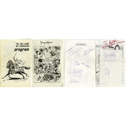 <B>1969 Comic Art Convention Program with Many Comic Creator Autographs (1969).</B></I> This lot features a vintage, autographed copy of the <B>1969 Comic Art Convention Program, </B></I>for the Phil Seuling con held on July 4th-6th at the Statler-Hilton Hotel in New York City. Our consignor of the <B>Amazing Spider-Man </B></I>#23 page (featured elsewhere in this catalog, as Lot 44108) was in attendance, and besides having the good fortune to land an original Steve Ditko page, our consignor also had the time to acquire the autographs of the many comic book greats attending. Indeed, this 5.5" x 8.5" booklet was signed by Frank Frazetta, Dick Giordano, Murphy Anderson, Gil Kane, Gray Morrow, Mark Hanerfeld, John Fantucchio, Roy Thomas, and Jim Warren. Two pieces of loose paper included with the program have the additional signatures of Syd Shores, Archie Goodwin, and Bill Everett. What a show! Aside from some minor wear, the program is in Excellent condition.<BR><BR><b>Shipping:</b> Books & Catalogs (<a target="_blank" href="http://www.heritageauctions.com/common/shipping.php">view shipping information</a>)