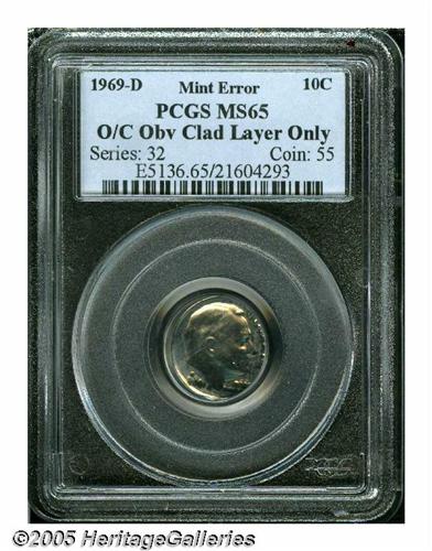<B>1969-D<10C> Roosevelt Dime--Off Center, Obverse Clad Layer Only--MS65 PCGS.</B></I> A curious double mint error. Struck several degrees off center toward 8:30, the piece partly wrapped around the obverse die with sufficient force to cleanly separate the obverse clad layer from the remainder of the coin. The untoned reverse shows an incused mirror image of the obverse, which has light gray-gold color.