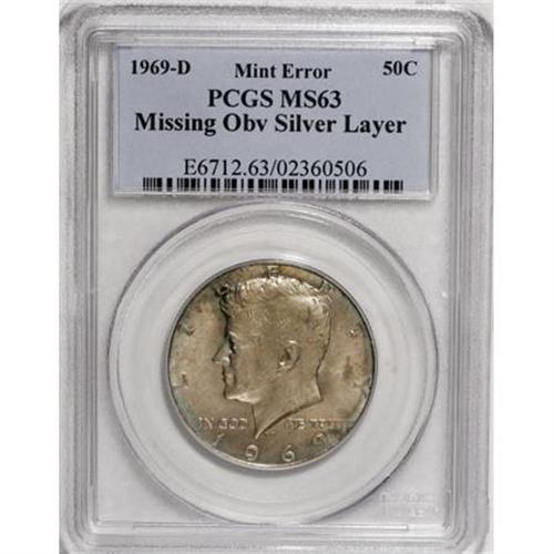 <B>1969-D 50C Kennedy Half Dollar--Missing Obverse Silver Layer--MS63 PCGS.</B></I> <BR><BR><B>Coin Engraver:</B> Gilroy Roberts and Frank Gasparro<BR><BR><b>Shipping:</b> Coins & Currency (<a target="_blank" href="http://www.heritageauctions.com/common/shipping.php">view shipping information</a>)