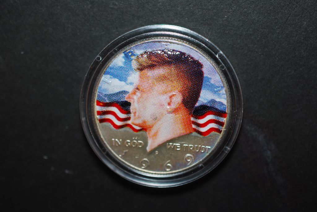 1969-D US Kennedy Half Dollar With Colorized Obv. In Display Case; EST. $15-20